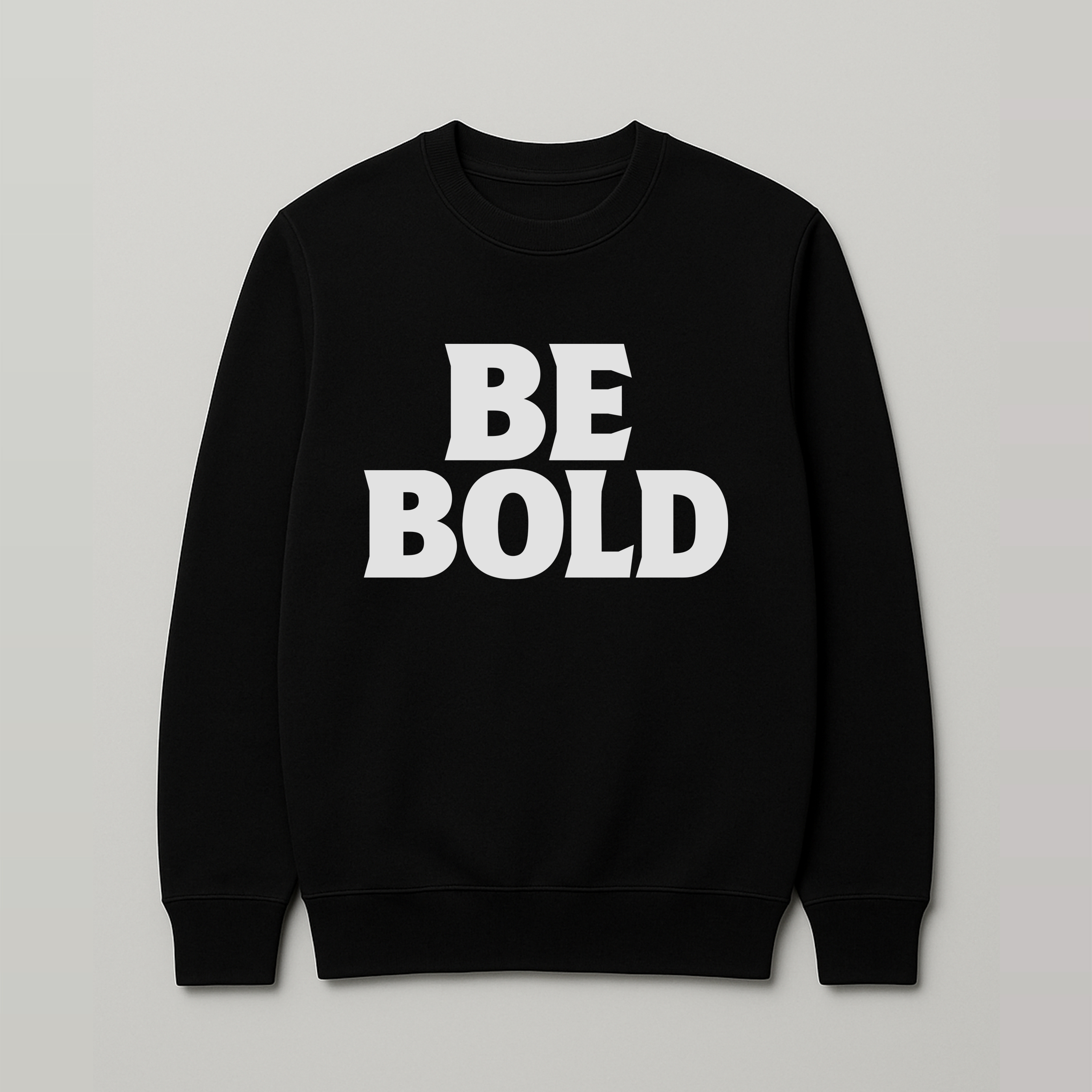 Czarna bluza bez kaptura z wyrazistym nadrukiem „BE BOLD” na froncie. Prosty, klasyczny fason z okrągłym dekoltem sprawia, że bluza jest wygodna i ponadczasowa, a mocny nadruk podkreśla pewność siebie i charakter stylizacji. Plecy pozostają gładkie – bez dodatkowych nadruków.
