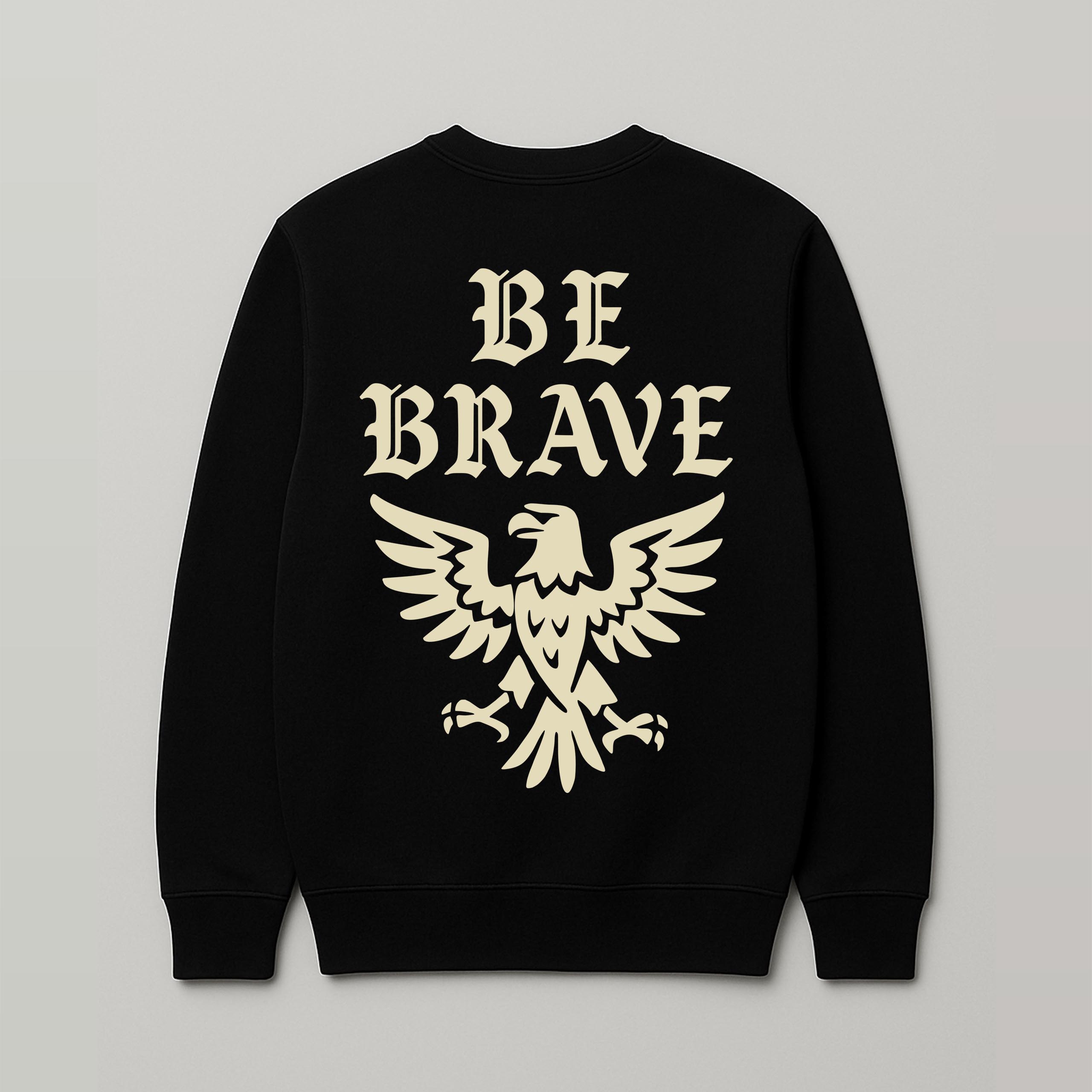 Na piersi znajduje się delikatne logo marki, natomiast na plecach duży nadruk „BE BRAVE” z symbolem orła. Klasyczny krój ze ściągaczami przy rękawach i dole zapewnia wygodę oraz uniwersalny charakter bluzy.