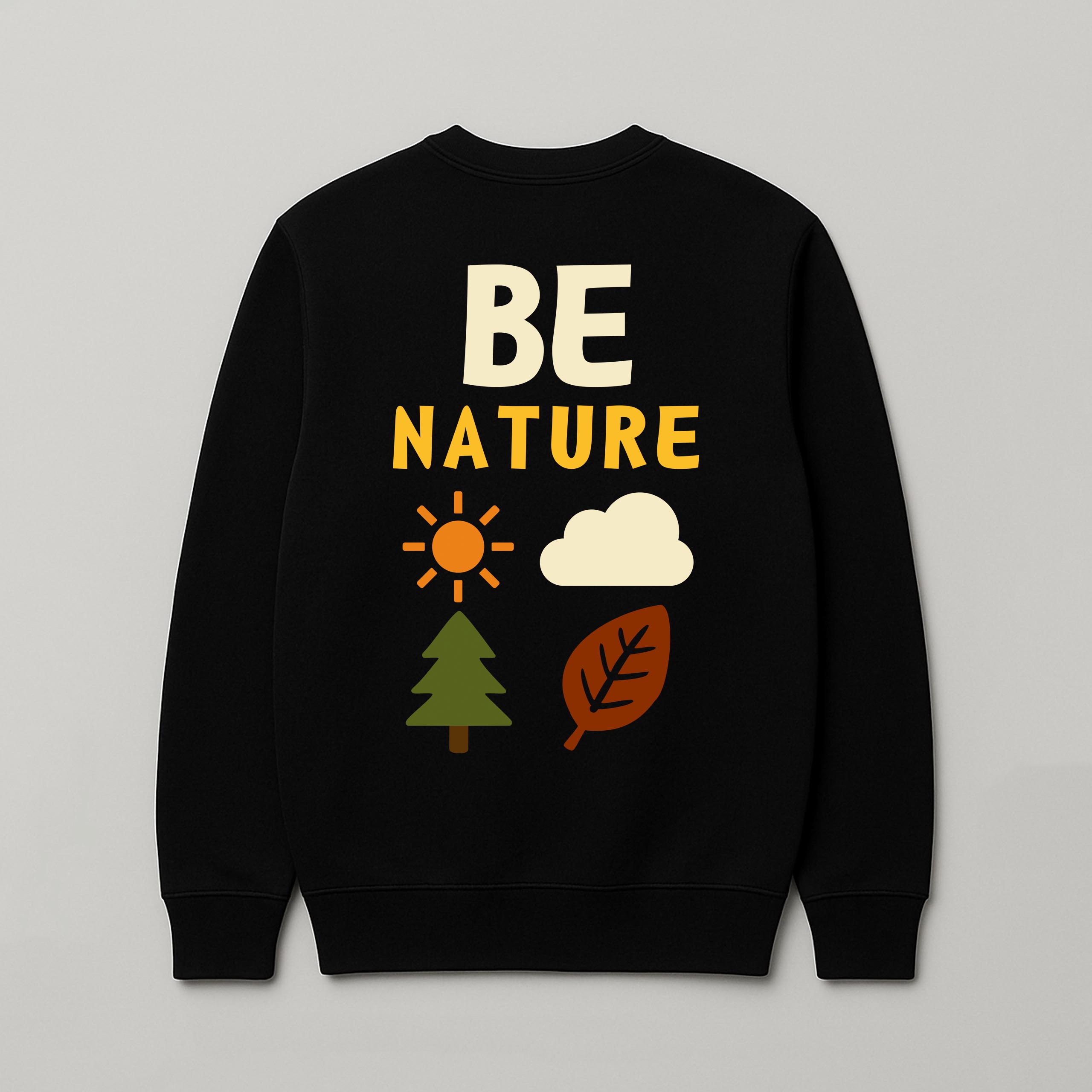 Na piersi znajduje się subtelne logo marki, a na plecach grafika „BE NATURE” z elementami natury – symbolem równowagi i życia w zgodzie z otoczeniem.