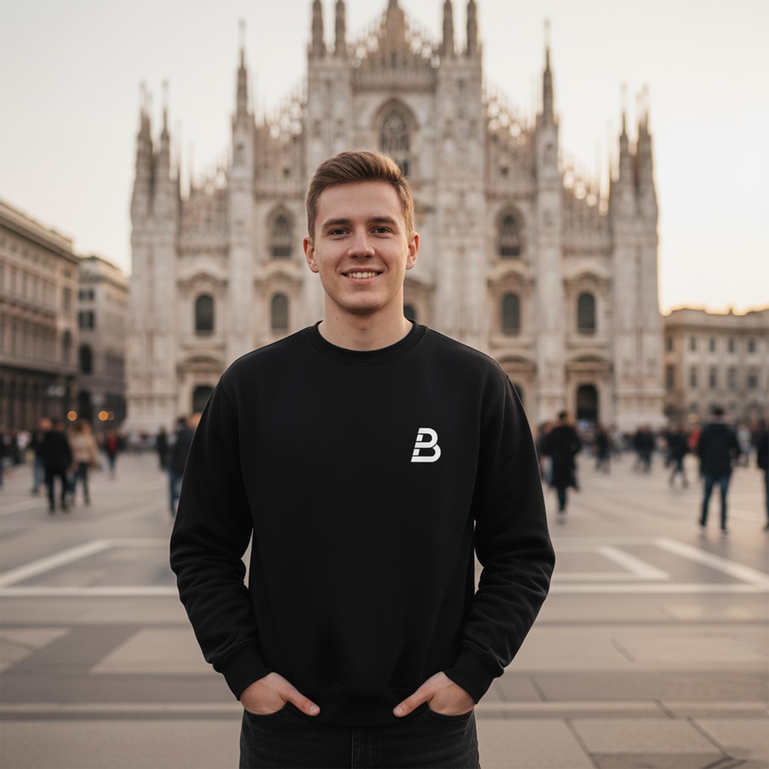 Czarna bluza bez kaptura, uszyta w Polsce z dzianiny drapanej o gramaturze 320 g. Dzięki procesowi enzymowania materiał stał się miękki, gładki i trwały.